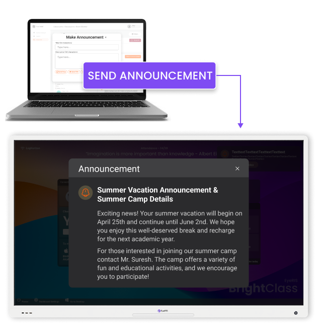Administrators can remotely send notices to any digital board from any location, allowing for real-time updates and announcements across the classroom network. This feature ensures efficient communication and keeps everyone informed