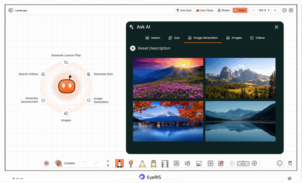EyeRIS’s AI Video and Image Tool simplifies lesson creation by generating curriculum-aligned visuals tailored to your topic. Integrated with interactive flat panels, it brings concepts to life with engaging videos and images, making teaching dynamic and impactful. Save time and captivate students with EyeRIS!
