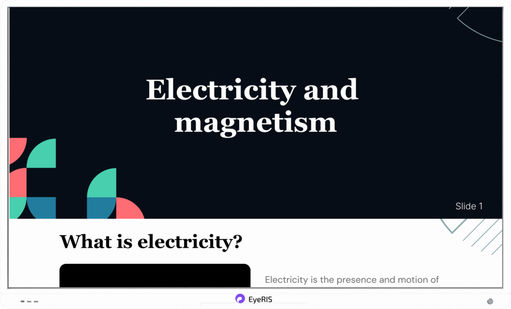 EyeRIS’s AI Teaching Tool streamlines lesson planning by creating curriculum-aligned, interactive presentations. Input a topic and grade, and the AI smart board generates engaging slides with multimedia, ready for seamless use on interactive flat panels. Save time and deliver impactful, customizable lessons with EyeRIS, the ultimate digital board for teaching.